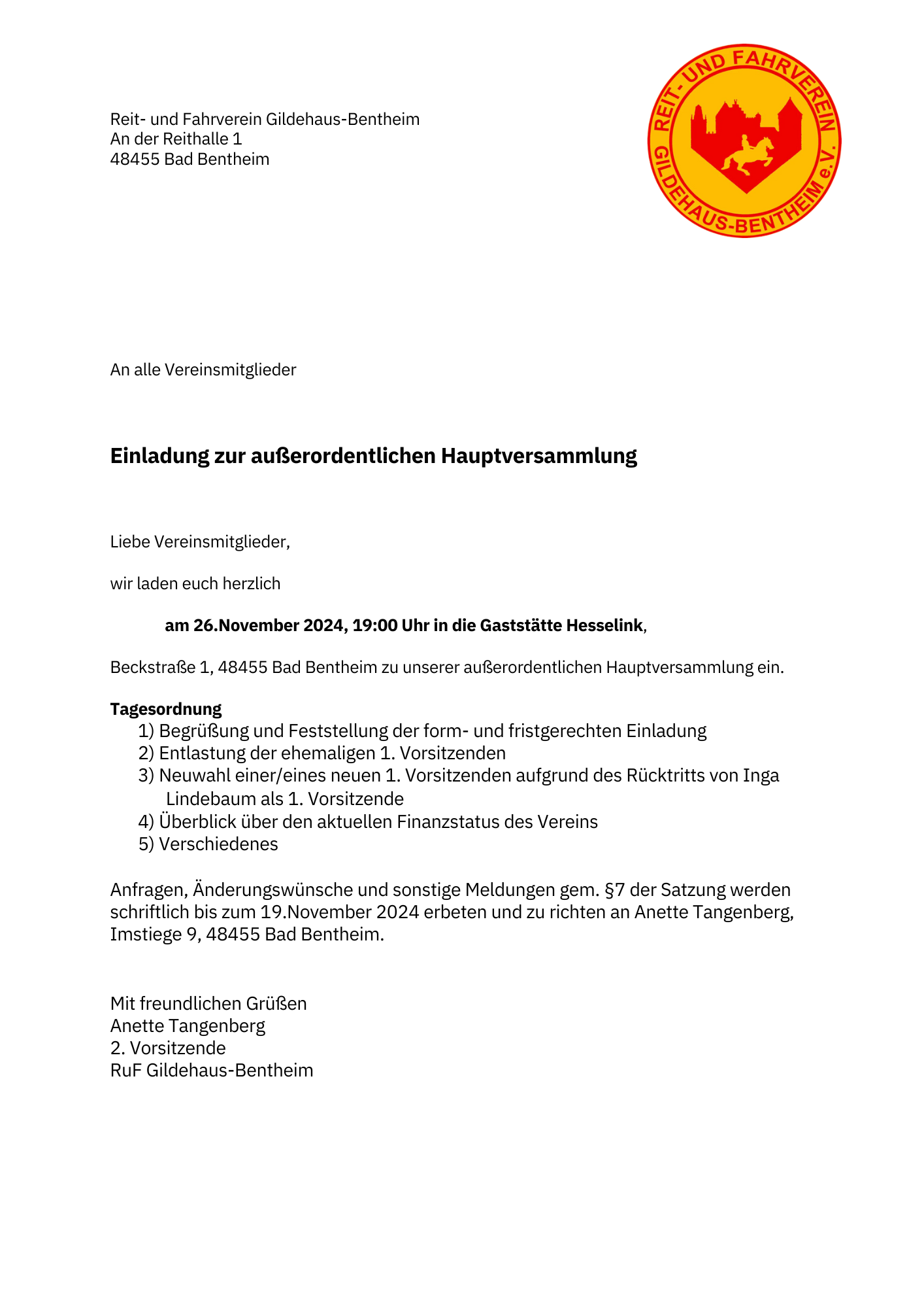 wir laden euch herzlich am 26.November 2024, 19:00 Uhr in die Gaststätte Hesselink, Beckstraße 1, 48455 Bad Bentheim zu unserer außerordentlichen Hauptversammlung aufgrund des Rücktritts von Inga Lindebaum als 1. Vorsitzende ein. Tagesordnung 1) Begrüßung und Feststellung der form- und fristgerechten Einladung 2) Entlastung der ehemaligen 1. Vorsitzenden 3) Neuwahl einer/eines neuen 1. Vorsitzenden 4) Überblick über den aktuellen Finanzstatus des Vereins 5) Verschiedenes Anfragen, Änderungswünsche und sonstige Meldungen gem. §7 der Satzung werden schriftlich bis zum 19.November 2024 erbeten und zu richten an Anette Tangenberg, Imstiege 9, 48455 Bad Bentheim.