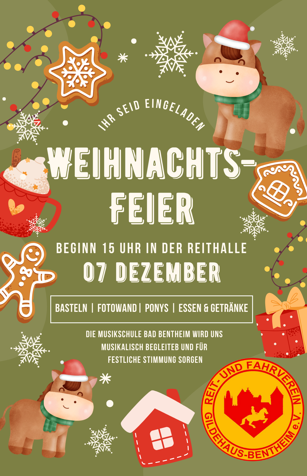 Bitte meldet euch unter dem Punkt "Veranstaltungen Anmeldungen" an, damit wir besser planen können. Wir laden alle herzlich zu unserer Weihnachtsfeier ein! Lasst uns gemeinsam die festliche Zeit genießen und einen wundervollen Nachmittag zusammen verbringen. Wir werden Bastelstationen für die Kinder vorbereiten sowie eine Fotowand aufstellen, an der wir Erinnerungen an diesen Nachmittag festhalten können. Ponys sind natürlich auch dabei. Diese werden dann für Fotos und zum Streicheln zur Verfügung stehen. Die Musikschule aus Bad Bentheim wird uns musikalisch begleiten und für festliche Stimmung sorgen. Und auch der Nikolaus schaut bei uns vorbei. Für das leibliche Wohl ist gesorgt - es erwartet euch eine Auswahl an Speisen und Getränken. Kommt vorbei und verbringt einen schönen Nachmittag mit uns! Wir freuen uns auf eine gemütliche Zeit mit Euch und euren Familien.