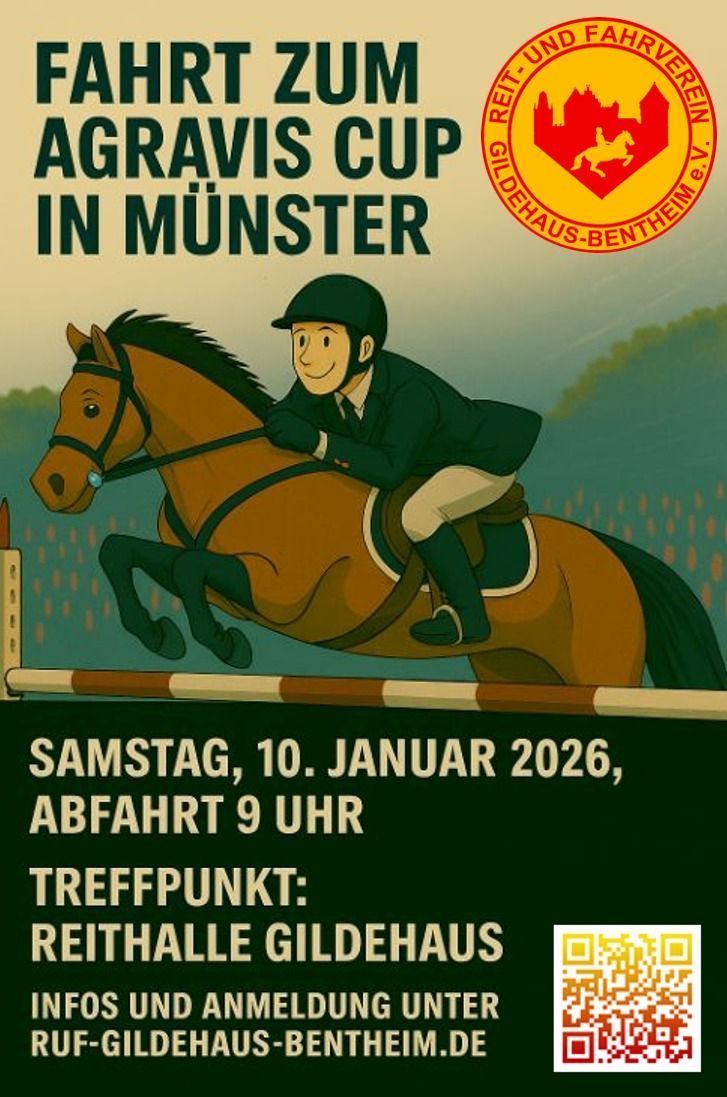 Am Samstag, den 10. Januar ist es wieder so weit: Unser Reitverein macht sich auf den Weg zum AGRAVIS Cup Münster – einem der renommiertesten Hallenreitturniere in Westfalen! In der Halle Münsterland erwarten Euch spannende Spring- und Dressurprüfungen, ein abwechslungsreiches Rahmenprogramm und eine mitreißende Atmosphäre, die jedes Pferdesportherz höherschlagen lässt. 📅 Ablauf des Tages • Abfahrt: 9:00 Uhr ab Reithalle Gildehaus (An der Reithalle 3) im komfortablen Reisebus • Ankunft in Münster: ca. 10:00 Uhr – Zugang zu allen Wettbewerben inklusive • Rückfahrt: 17:15 Uhr ab Münster • Zurück in Gildehaus: ca. 18:15 Uhr – anschließend gemütliches Public Viewing im Reiterstübchen 👥 Teilnahme & Kosten • Maximal 50 Plätze verfügbar – schnell sein lohnt sich! • Kosten: o 35 € für Vereinsmitglieder o 40 € für Freunde des Vereins, Reitsportbegeisterte aus der Grafschaft und alle, die Lust auf einen tollen Tag haben 😊 📝 Anmeldung Bitte meldet Euch bis Donnerstag, den 4. Dezember verbindlich an. Es gilt das Windhund-Prinzip – wer zuerst kommt, reitet zuerst mit! Die Anmeldung ist erst nach Zahlungseingang gültig. Hier geht es zur Zahlung für Vereinsmitglieder (35 Euro)... Hier geht es zur Zahlung für Nicht-Vereinsmitglieder (40 Euro)... ℹ️ Fragen? Das Orga-Team steht Euch gerne zur Verfügung: • Sandra Bergjan – 📞 0173 / 2378397 • Christian Post – 📞 0174 / 314520